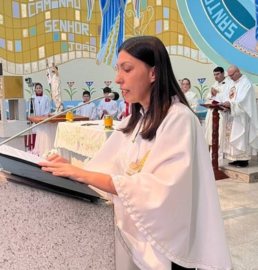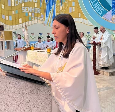 Comecei a servir como coroinha na Paróquia São João Batista em 2001 quando tinha 10 anos. Isso me ajudou a crescer na minha fé e a buscar uma vida mais próxima de Deus. Ser coroinha me ensinou a importância de estar presente na Santa Missa e de participar ativamente da liturgia. Tive a oportunidade de servir com os Padres Stanislaw (in memoriam), Benedito (in memoriam) e com o Padre Zdzislaw, essa experiência me fez sentir parte da Igreja, o serviço junto ao altar me mostrou que não importa a idade, todos podemos servir a Deus. Dezessete anos depois tenho a benção de servir junto com o meu filho Mateus, que é acólito, agora como ministra extraordinária da Sagrada Comunhão. Espero que mais jovens se sintam inspirados a servir a Deus e a participar mais ativamente da Igreja.