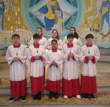 Os coroinhas e acólitos fazem parte da equipe de liturgia e auxiliam nas celebrações, juntamente com os ministros extraordinários, leitores, cantores, exercendo esse serviço com amor, simplicidade e humildade.